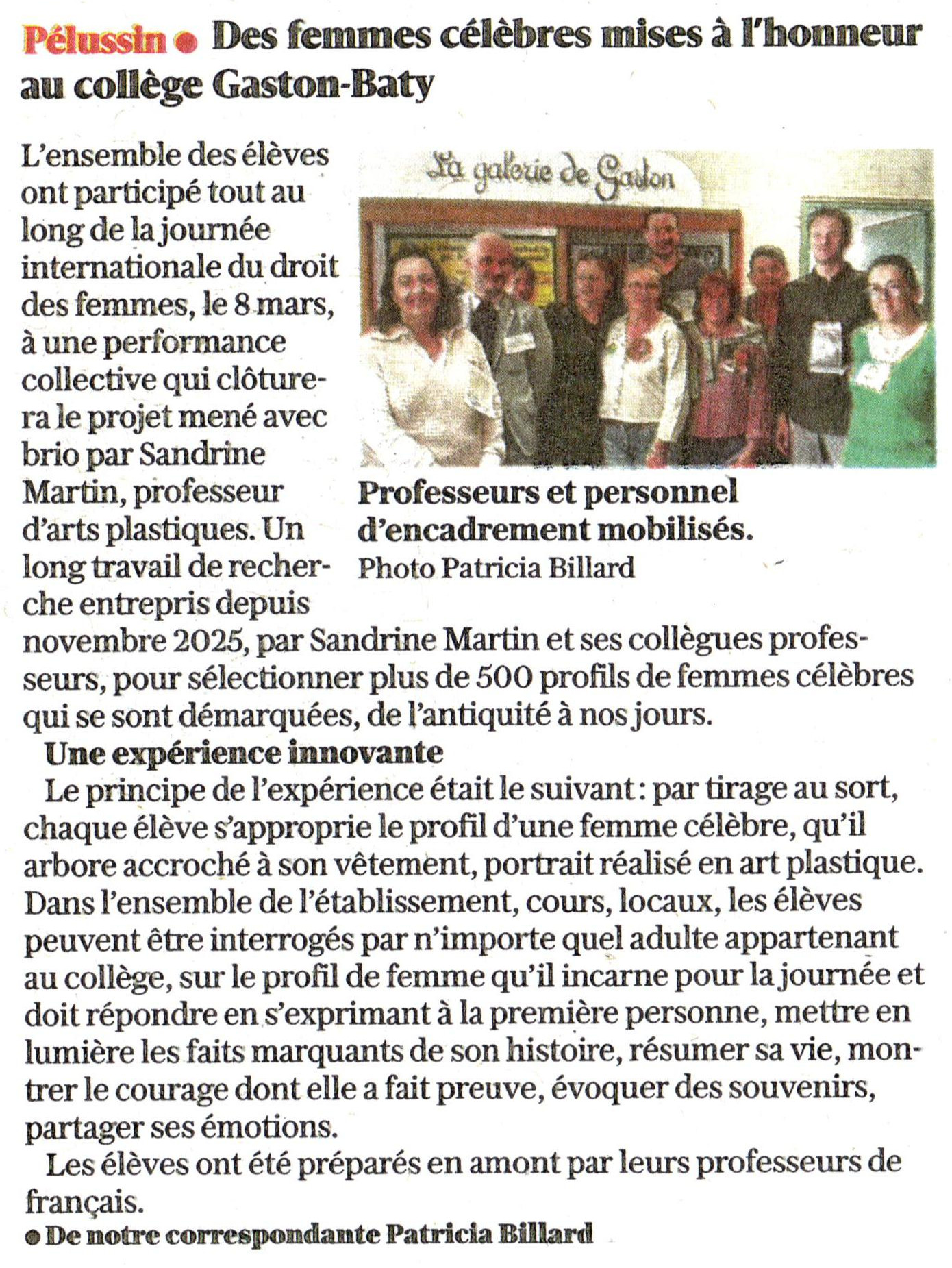 Le Progrès du samedi 14 mars 2026 : Des femmes célèbres mises à l’honneur au collège Gaston-Baty